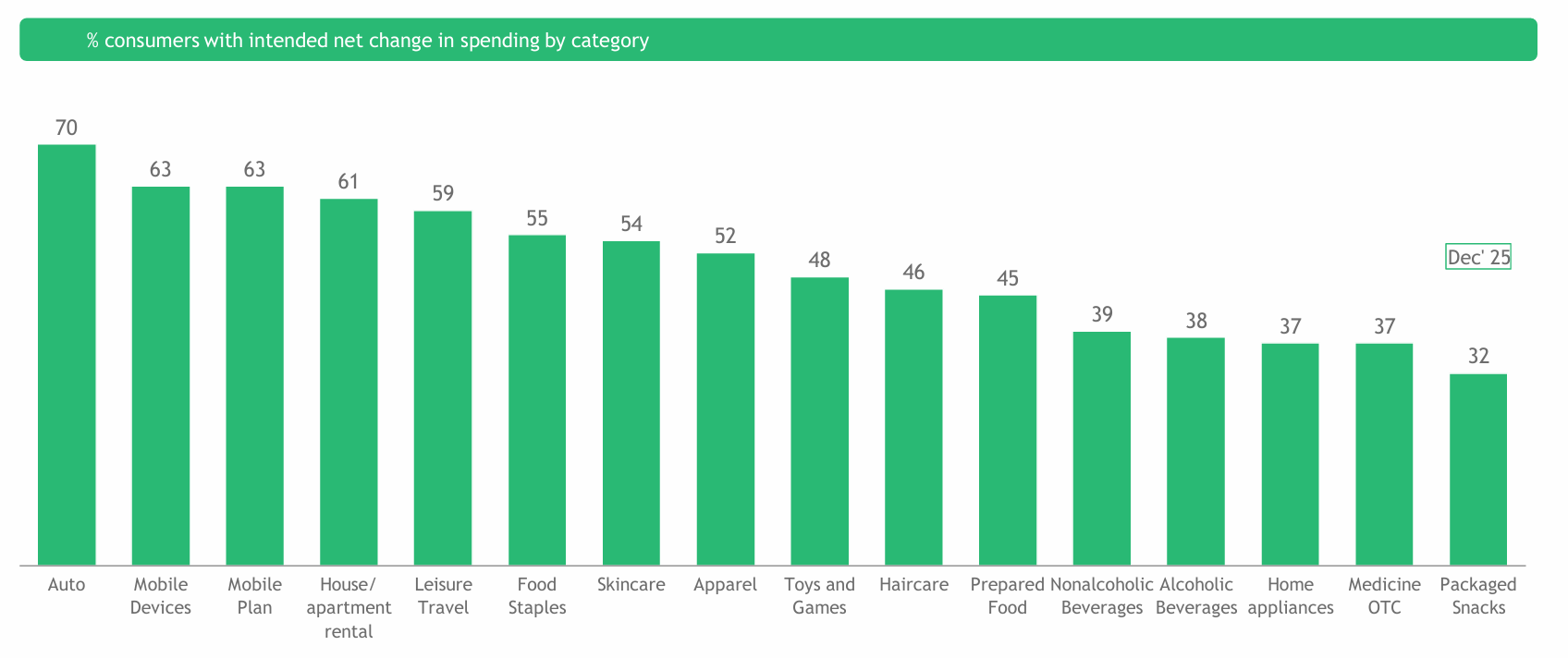 60% of consumers expect their total spends to be higher in the next six months, up from 50% in Sept’24. All tracked categories show net expected increases, led by automobiles (+70%), mobile plans and devices (+63% each).
